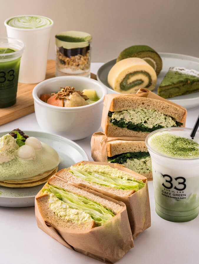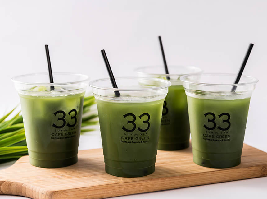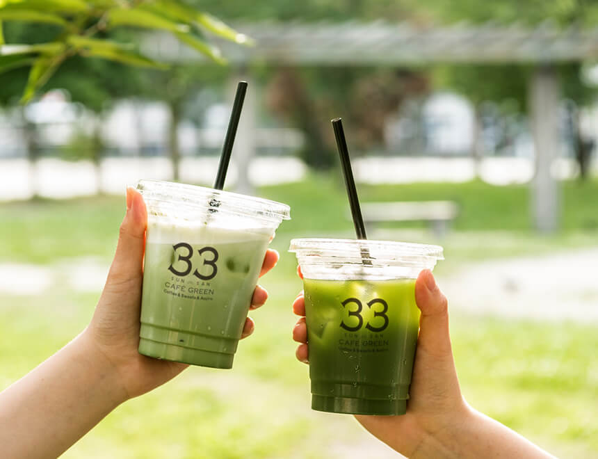 33カフェグリーンのネーミングの由来は3つのポイントから出来ています。社名であるアサヒ(朝日)が昇って『燦々(さんさん)と輝く毎日を応援』という意味を込め「健康」「おいしさ」「おもてなし」をご提供します。
