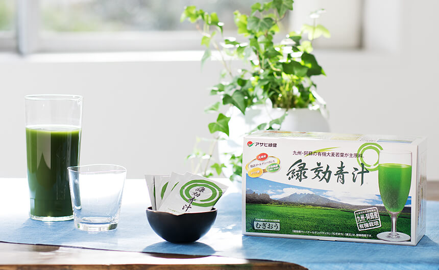 当社の看板商品である「緑効青汁」は、九州、阿蘇で農薬を一切使用せず有機栽培した大麦若葉「むぎおう」を主原料に乳酸菌、食物繊維、オリゴ糖を加えた青汁です。栄養バランスはもちろん、その最大の特長は青汁と思えない「飲みやすさ」がご好評頂いている理由です。